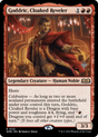 Haste Celebration — As long as two or more nonland permanents entered the battlefield under your control this turn, Goddric, Cloaked Reveler is a Dragon with base power and toughness 4/4, flying, and "{R}: Dragons you control get +1/+0 until end of turn." (It loses all other creature types.)