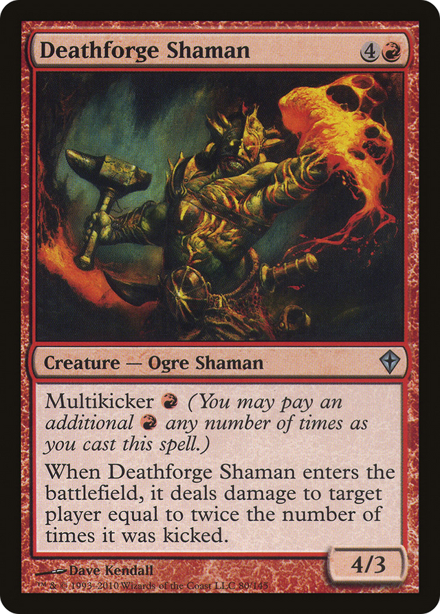 When Deathforge Shaman enters the battlefield, it deals damage to target player or planeswalker equal to twice the number of times it was kicked.