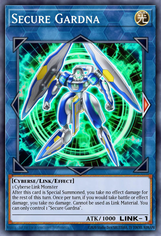After this card is Special Summoned, you take no effect damage for the rest of this turn. Once per turn, if you would take battle or effect damage, you take no damage. Cannot be used as Link Material. You can only control 1 "Secure Gardna".