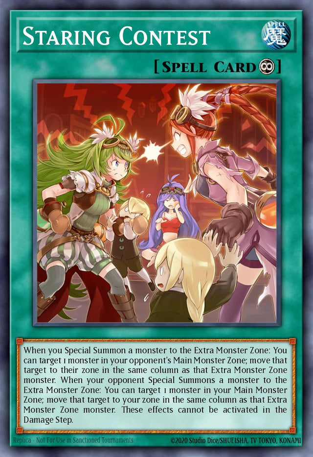 When you Special Summon a monster to the Extra Monster Zone: You can target 1 monster in your opponent's Main Monster Zone; move that target to their zone in the same column as that Extra Monster Zone monster. When your opponent Special Summons a monster to the Extra Monster Zone: You can target 1 monster in your Main Monster Zone; move that target to your zone in the same column as that Extra Monster Zone monster. These effects cannot be activated in the Damage Step.