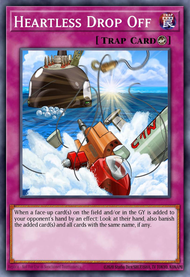 When a face-up card(s) on the field and/or in the GY is added to your opponent's hand by an effect: Look at their hand, also banish the added card(s) and all cards with the same name, if any.