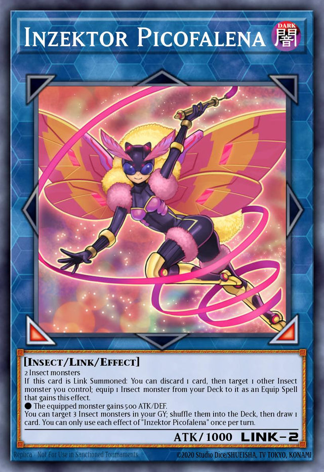 2 Insect monsters If this card is Link Summoned: You can discard 1 card, then target 1 other Insect monster you control; equip 1 Insect monster from your Deck to it as an Equip Spell that gains this effect. ● The equipped monster gains 500 ATK/DEF. You can target 3 Insect monsters in your GY; shuffle them into the Deck, then draw 1 card. You can only use each effect of "Inzektor Picofalena" once per turn.