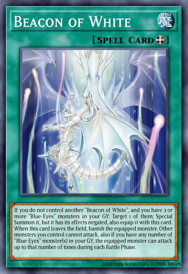 If you do not control another "Beacon of White", and you have 3 or more "Blue-Eyes" monsters in your GY: Target 1 of them; Special Summon it, but it has its effects negated, also equip it with this card. When this card leaves the field, banish the equipped monster. Other monsters you control cannot attack, also if you have any number of "Blue-Eyes" monster(s) in your GY, the equipped monster can attack up to that number of times during each Battle Phase.