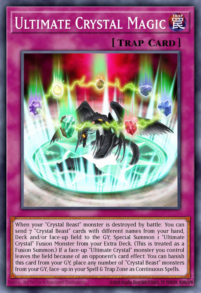 When your "Crystal Beast" monster is destroyed by battle: You can send 7 "Crystal Beast" cards with different names from your hand, Deck and/or face-up field to the GY; Special Summon 1 "Ultimate Crystal" Fusion Monster from your Extra Deck. (This is treated as a Fusion Summon.) If a face-up "Ultimate Crystal" monster you control leaves the field because of an opponent's card effect: You can banish this card from your GY; place any number of "Crystal Beast" monsters from your GY, face-up in your Spell & Trap Zone as Continuous Spells.