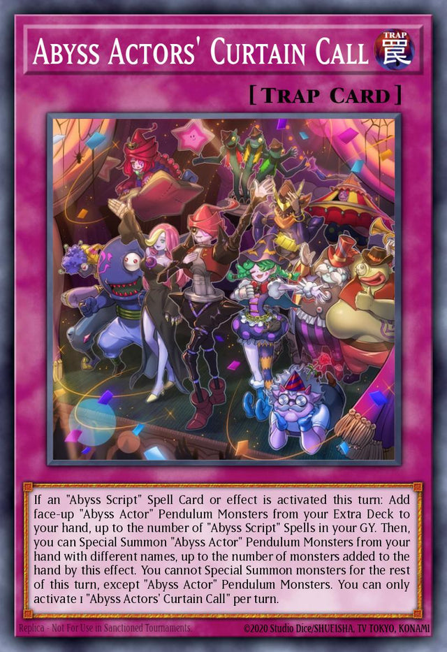 If an "Abyss Script" Spell Card or effect is activated this turn: Add face-up "Abyss Actor" Pendulum Monsters from your Extra Deck to your hand, up to the number of "Abyss Script" Spells in your GY. Then, you can Special Summon "Abyss Actor" Pendulum Monsters from your hand with different names, up to the number of monsters added to the hand by this effect. You cannot Special Summon monsters for the rest of this turn, except "Abyss Actor" Pendulum Monsters. You can only activate 1 "Abyss Actors' Curtain Call" per turn.