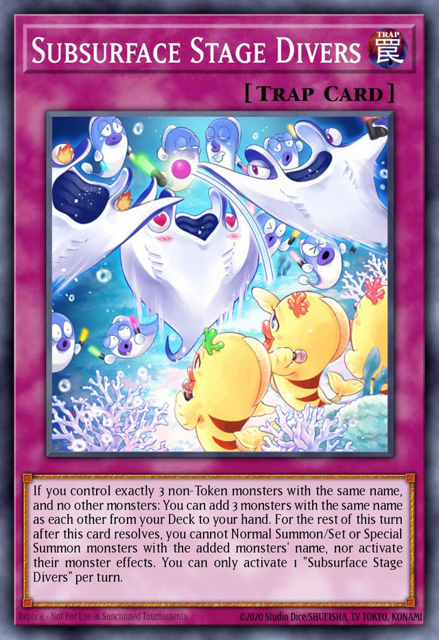 If you control exactly 3 non-Token monsters with the same name, and no other monsters: You can add 3 monsters with the same name as each other from your Deck to your hand. For the rest of this turn after this card resolves, you cannot Normal Summon/Set or Special Summon monsters with the added monsters' name, nor activate their monster effects. You can only activate 1 "Subsurface Stage Divers" per turn.