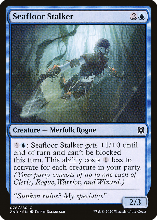 {4}{U}: Seafloor Stalker gets +1/+0 until end of turn and can't be blocked this turn. This ability costs {1} less to activate for each creature in your party. (Your party consists of up to one each of Cleric, Rogue, Warrior, and Wizard.)
