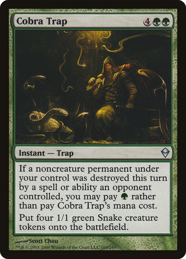 If a noncreature permanent under your control was destroyed this turn by a spell or ability an opponent controlled, you may pay {G} rather than pay this spell's mana cost. Create four 1/1 green Snake creature tokens.